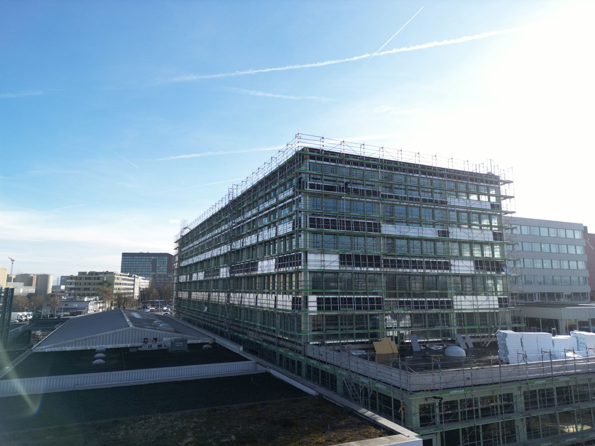 Inzwischen haben wir das obere Ende der Wendeltreppe erreicht, stehen auf der Dachterrasse und bewundern die grossartige Aussicht auf die Umgebung. Was macht Erkan Ates besonders stolz, während wir hier ganz oben auf dem Neubau stehen und er auf die bisherige Planungs- und Bauzeit zurückblickt? Und was wünscht er denjenigen, die in Zukunft in diesem Gebäude lernen und arbeiten werden? «Besonders stolz bin ich zum jetzigen Zeitpunkt darauf, dass wir sehr gut im Terminplan liegen, dass die Zusammenarbeit auf der Baustelle hervorragend funktioniert und – ganz besonders wichtig – dass wir bisher unfallfrei arbeiten konnten. Den zukünftigen Nutzerinnen und Nutzern wünsche ich, dass sie sich in diesem Gebäude wohlfühlen und gerne hierherkommen: dass es ein Ort wird, an dem Lernen, Arbeiten und Austausch Freude machen!»