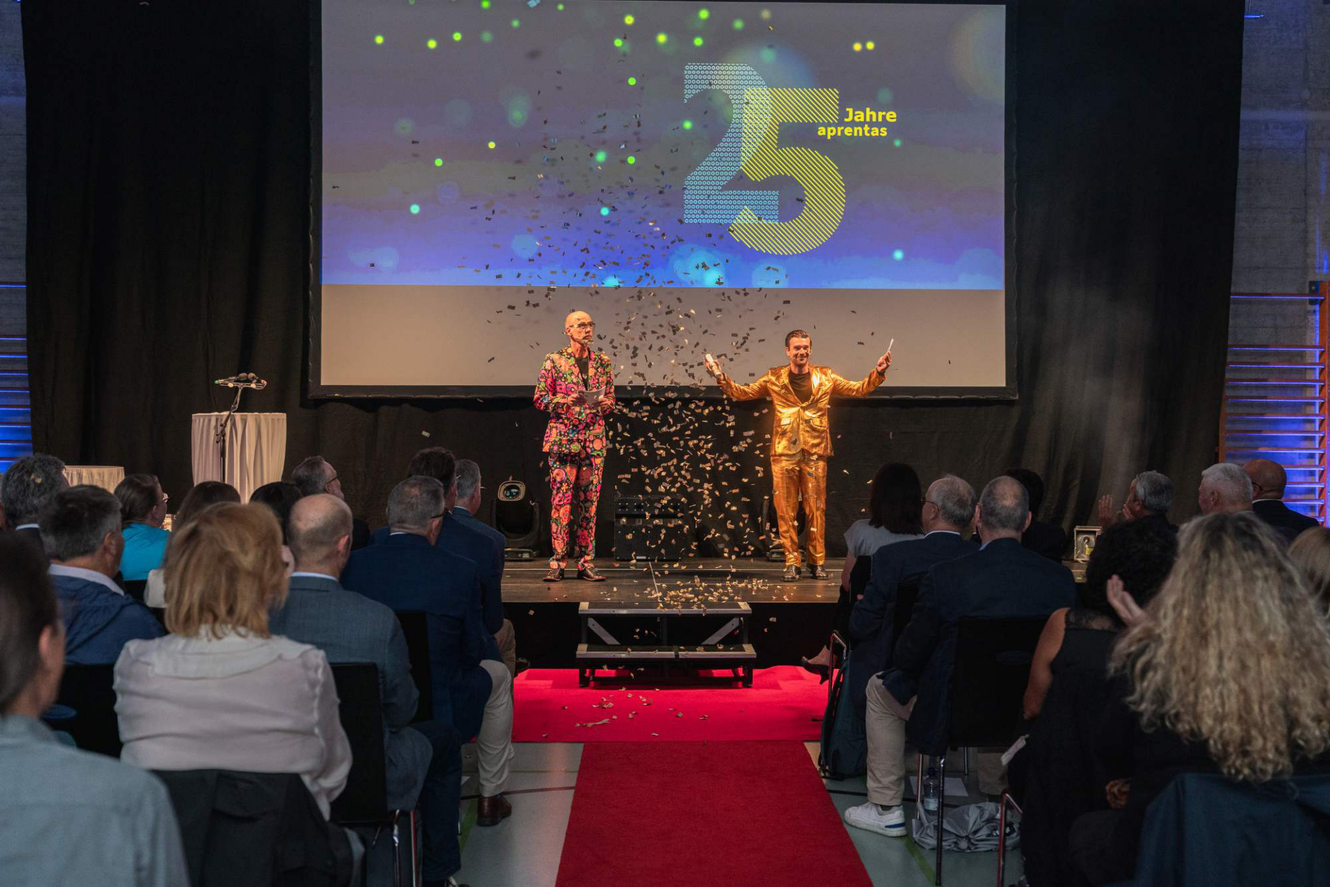Mit Charme, viel Modemut und Konfettikanonen moderierten Martin Oppliger und Marc Dinkel von aprentas den Anlass. Sie durften nun drei ehemalige Lernende, die ihre Grundausbildung bei einer aprentas-Mitgliedfirma gemacht hatten, auf die Bühne bitten. Livia Knörr, Philip Arabin und Remo Flury schilderten, wie sie ihre Lehrzeit erlebt hatten, wie sie sich danach beruflich weiterentwickelt hatten und was ihnen die Lehre aus heutiger Sicht bedeutet. Besonders bewegend war eine Aussage von Livia Knörr: Sie habe seither mehrere anspruchsvolle Weiterbildungen erfolgreich absolviert, aber so stolz wie bei ihrem Lehrabschluss sei sie danach nie mehr gewesen!