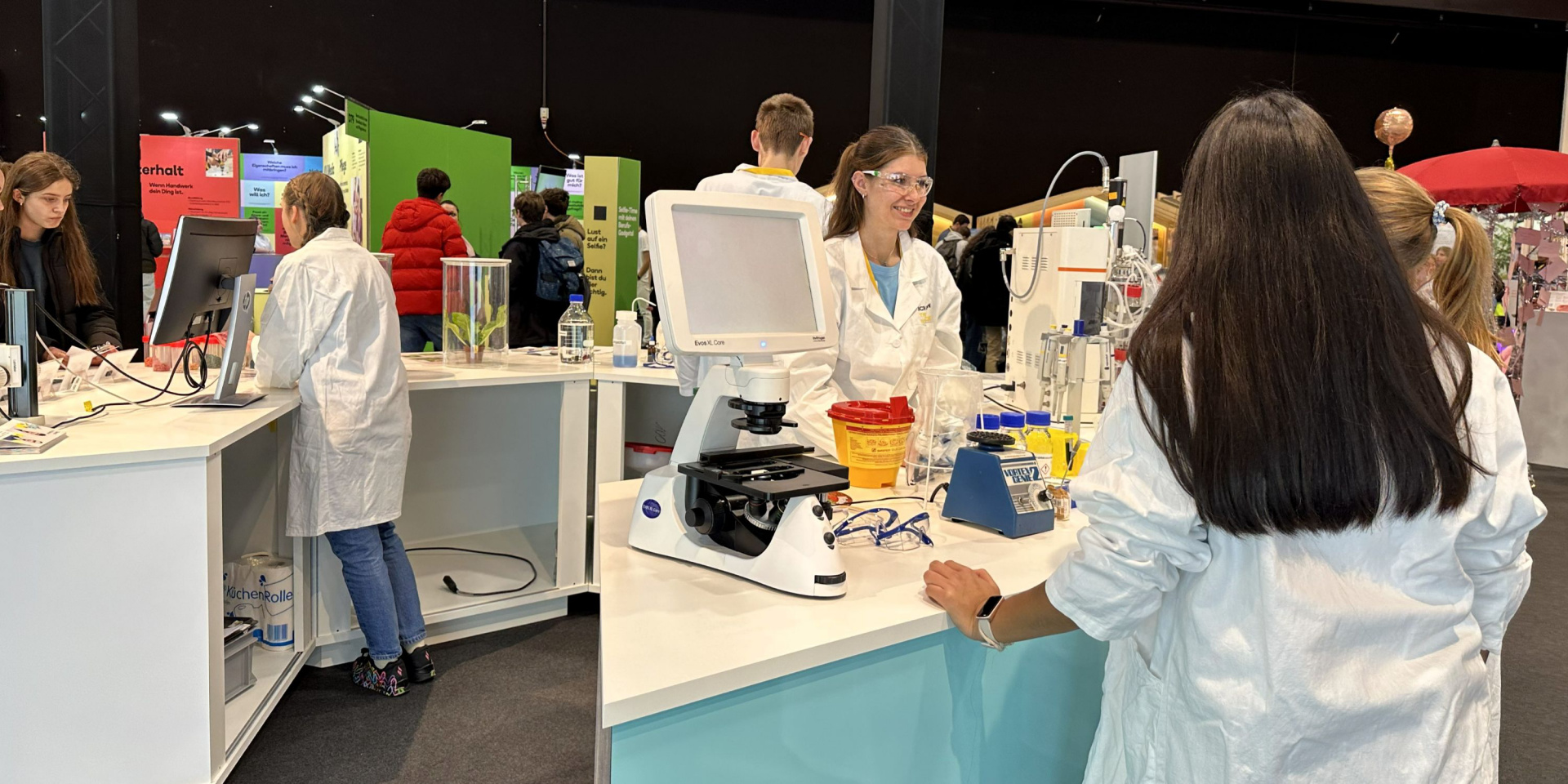Die Zusammenarbeit der vielen verschiedenen Unternehmen ermöglichte eine grosse Bandbreite an Themen und Experimenten. Die Aktivitäten reichten vom Beobachten von Hefezellen oder Pflanzenschädlingen über das Ergründen der Funktionsweise von Tintenkiller bis hin zum chemischen Labyrinth, an dem man Prozesse steuern kann, wie sie in der chemisch-pharmazeutischen Produktion vorkommen können.