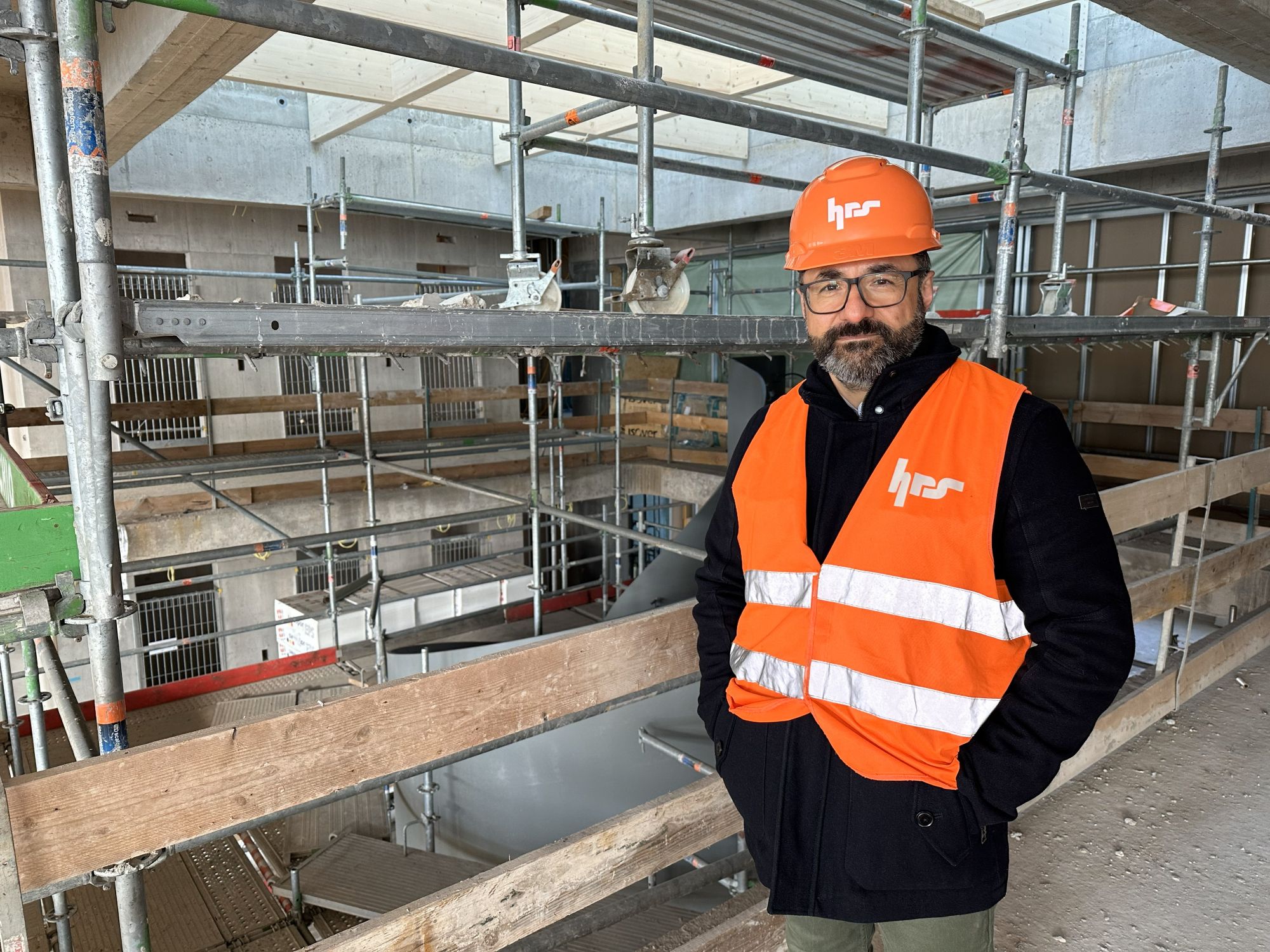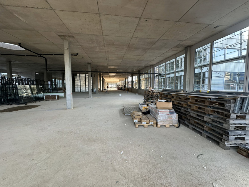 Zurzeit liege der Fokus darauf, das Gebäude dicht und wetterfest zu bekommen: eine wichtige Voraussetzung für viele Ausbauarbeiten. Wir gehen weiter in die Obergeschosse, wo bereits mit dem Erstellen der raumbildenden Wände begonnen und der Unterbau für die späteren Bodenbeläge eingebracht worden ist. Dorthin gelangen wir über die markante Stahlwendeltreppe im Atrium – ganz klar ein Highlight des Gebäudes. Dem vertikalen Durchblick im Lichthof über alle Stockwerke hinweg steht vorläufig noch ein Gerüst im Weg – denn es gibt noch einiges zu tun, angefangen bei der Verkleidung der Unterseite der Treppe.