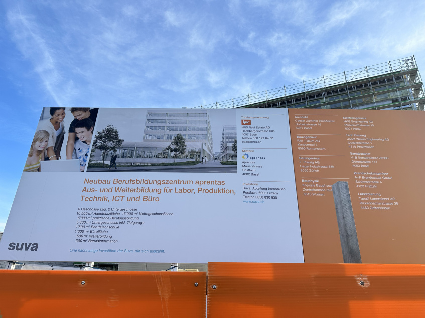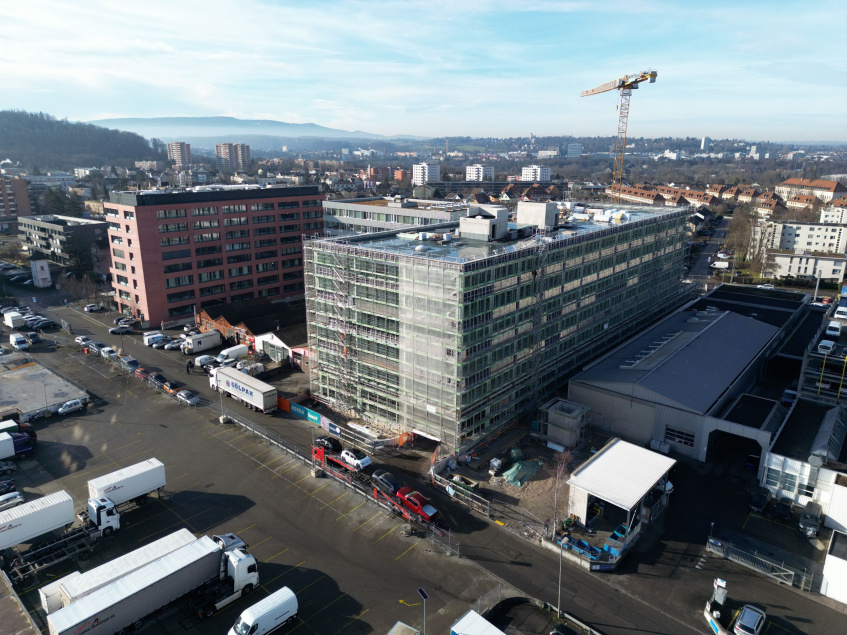 Das Gebäude steht – und es sieht sehr stattlich aus! Nachdem der Rohbau des neuen aprentas-Ausbildungszentrums auf dem Polyfeld-Areal in Muttenz im Herbst fertiggestellt worden ist, zeigen sich eindrücklich seine Dimensionen: 100 Meter Länge und sechs überirdische Stockwerke.